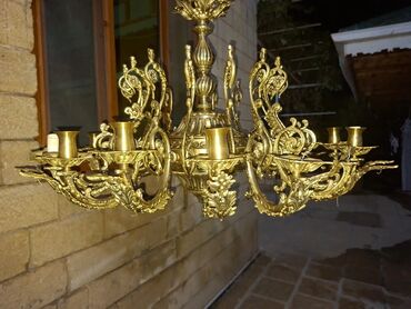 Klassik üslubda metal şamdan-lüstur - Material: bürünc rəngli metal konstruksiya, dekorativ kristal asqılar - Dizayn: çoxşaxəli qollar, hər qolun ucunda şam formasında patron yerləri; mərkəzdə oym...