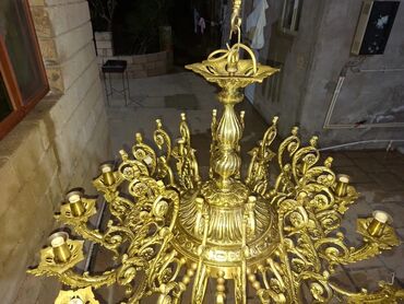 Klassik üslubda tavan çilçırağı - Material: metal korpus (qızılı/bronz tonlarda) və çoxsaylı kəsimli kristal asqılar - Dizayn: çoxqollu konstruksiya, hər qolda şam formalı E14 patronlu lampalar; m...