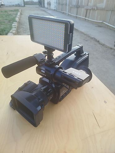 - Sony brendli peşəkar kamkorder (HD qeyd). Üstündə iri üst tutacaq, optik zumlu G-lens və geniş günbəzli lens qapağı.