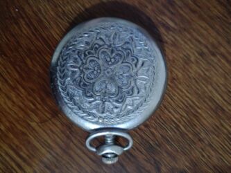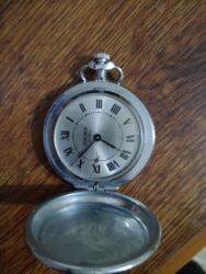 SEKONDA cib saatı, orijinal model. Gümüş rəngli metal korpuslu, qapaqlı (hunter case) dizayn. Ön və arxa qapaqda relyef naxışlı oyma – biri quş təsviri, digəri ornamental medalyon motivi. Saatın siferblatı açıq gümüş tonunda, qara Roma rəqəmləri və nazik nöqtəli minut izləri ilə. Üç əqrəbli quruluş (saat, dəqiqə, saniyə). Mexaniki qurma düyməli başlıq və asqı halqası mövcuddur. Brend loqotipi siferblat üzərində: SEKONDA. Kolleksiyaçılar və klassik üslub sevənlər üçün zərif cib saatı.