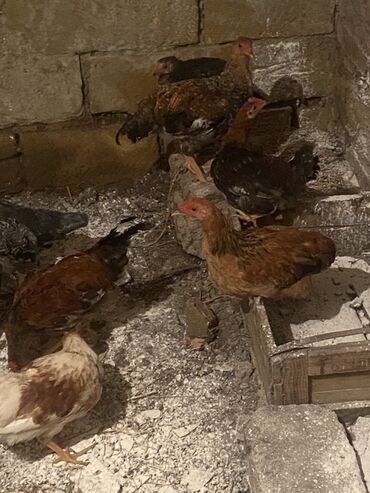 - Şəkillərdə müxtəlif rəng və naxışlarda bir neçə baş cavan kənd toyuqları görünür (qara, qəhvəyi, ağ və qarışıq rənglər).