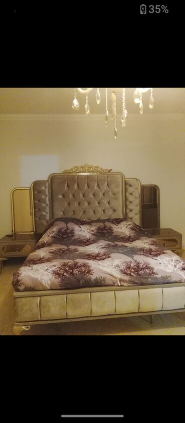 - Yataq çərçivəsi və yumşaq başlıq: kapitone işləməli, qızılı dekor elementləri ilə.