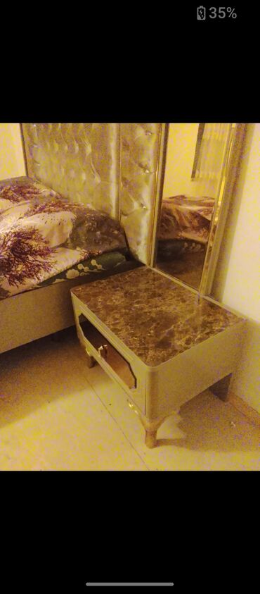 - 2 ədəd tumba: mərmər naxışlı üst səth, çekmece və dekorativ qapılar.