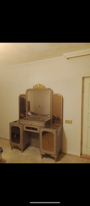 - Paltar masası (tualet masası): üçlü güzgü, üstü mərmər naxışlı, ortada çekmece, yanlarda qapılı bölmələr.
