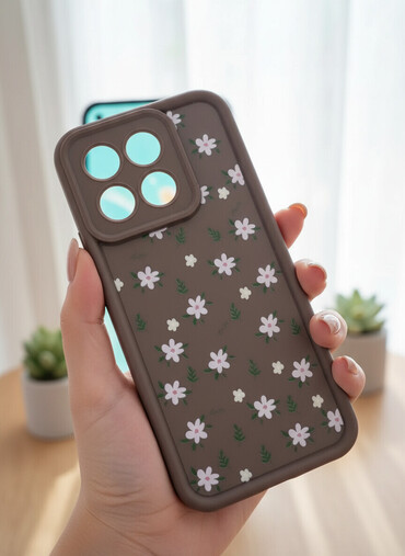 - Dizayn: Boz-qəhvəyi fonda ağ-çəhrayı çiçəklər və yaşıl yarpaqlarla bəzədilmiş naxış. Kamera modulunu tam əhatə edən qalınlaşdırılmış çərçivə var.