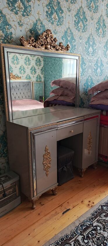 - Güzgülü makiyaj masası: geniş stolüstü, qapalı dolab bölmələri, oyma qızılı dekor, iri güzgü.