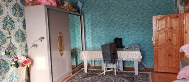 - Sürgülü qapılı iri şkaf: biri güzgülü, digəri dekorativ qızılı ornamentli qapı, daxili bölmələr və asılqan sahəsi.