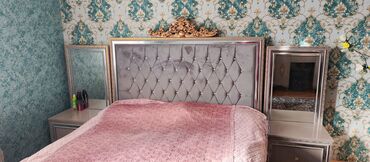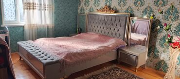 - Böyük ölçülü çarpayı: yumşaq kapitone başlıq, qızılı dekor elementləri, ön hissədə oturacaq tipli yumşaq skameyka ilə.