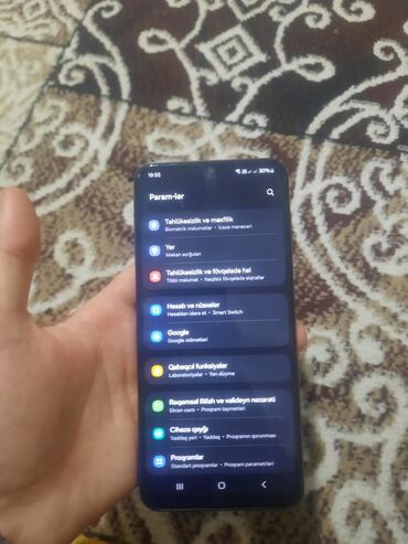 - Parametrlər bölməsi: Təhlükəsizlik və məxfilik, Hesablar və nüsxələr (Smart Switch dəstəyi), Qabaqcıl funksiyalar, Rəqəmsal rifah və valideyn nəzarəti, Cihaza giriş/Yaddaş, Proqramlar və s.