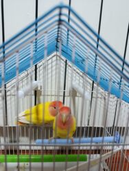 Növ: Sevgi quşu (Agapornis) Rəng: Parlaq sarı bədən, qarın tərəfi açıq ton, alında-qəfəsə qədər qırmızı-qızılı ləkə, yanaqlarda şaftalı/çəhrayı çalar, quyruq ucları ağ. Xüsusiyyətlər: - Əldə bəslən...
