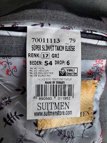 Guerro brendinə məxsus boz rəngdə, 50 ölçülü, 65% poliester, 33% viskon və 2% likradan hazırlanmış, ziyafət üçün nəzərdə tutulmuş kostyum. Türkiyədə istehsal olunub.
