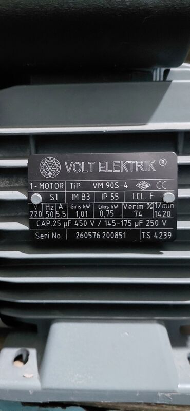 Nasoslar, kompressorlar, dəzgahlar və müxtəlif mexanizmlər üçün uyğun, sabit sürətli 0.75 kW təkfazlı asinxron mühərrik. Seriya nömrəsi: 260576200851. TS 4239 sertifikatlı.