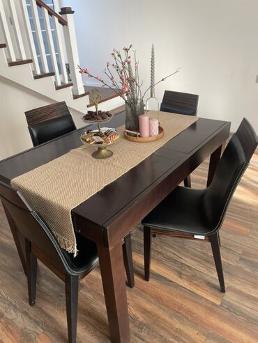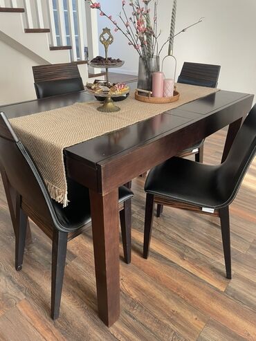- Stil: müasir-minimal dizayn, tünd qəhvəyi (vengə tonlarında) massiv ağac görünümlü masa və uyğunlaşan qara stullar