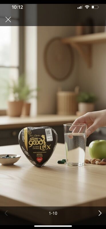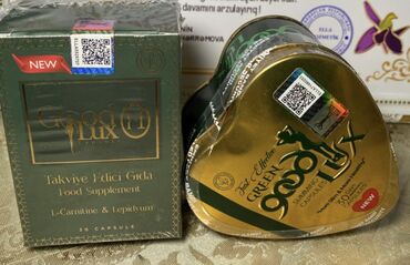 - Good Lux F1 Food Supplement – yaşıl/qara qutuda 30 kapsul. Tərkib: L‑Carnitine və Lepidyum (etiketdə göstərildiyi kimi).