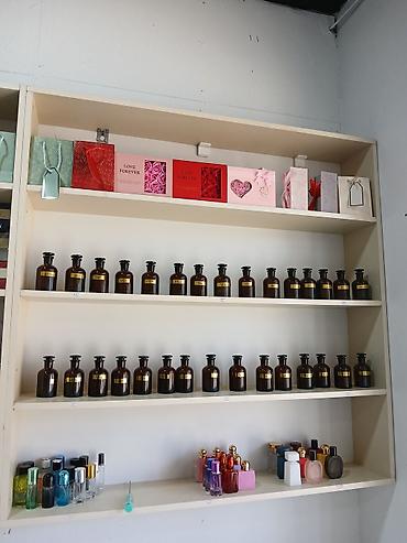 - Ətir və ətir ekstraktları: tünd şüşə flakonlarda ətir esansları, müxtəlif həcmlərdə doldurula bilən şüşə qablar və rəngarəng portativ flakonlar.