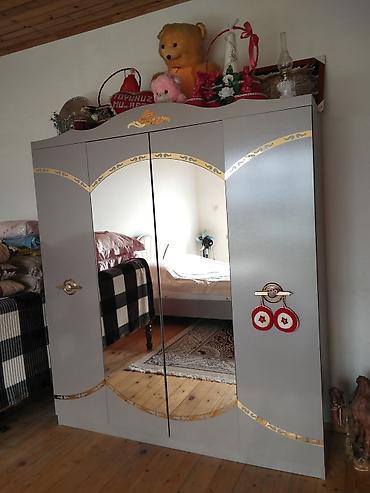 - Geniş 4 qapılı şkaf – orta hissədə tam boy güzgülər, boz rəngdə korpus, dekorativ qızılı elementlər və dairəvi tutacaqlar.