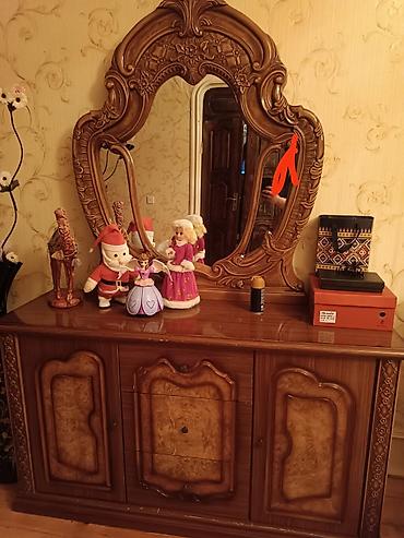 - Konsol/komod – mərkəzdə çekmecəli bölmə, yanlarda qapalı dolablar; üstündə iri, fiqurlu çərçivəli güzgü. Oyma detallar və parlaq laklı səth.