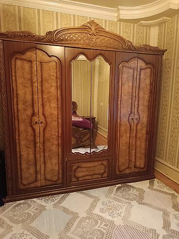 Klassik üslubda tam dəst yataq otağı mebeli Komplektin tərkibi: - Geniş 5 qapılı şkaf: ön tərəfi tam güzgülü, qızılı ornamentli çərçivə və dekorativ ayaqlar; içəridə asılqan bölmələri, rəflər və y...