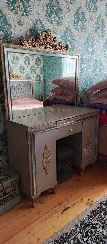 Yataq otağı dəsti - Dördqapılı qarderob: krem rəngli fasad, qara ornamental naxışlar, ortada iri dekorativ güzgü (iki qapıda), bükümlü metal tutacaqlar, dayanıqlı ayaqlar. - Çarpayı: yumşaq krem r...Giriş•Qeydiyyat