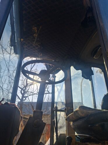 • Mavi rəngli sovet istehsalı tək oxlu ön asqılı traktor. Kabinli, geniş