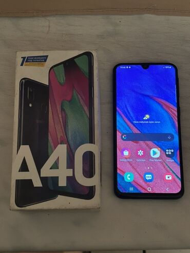 Samsung Galaxy A40 – orijinal qablaşdırmada. Xüsusiyyətlər (qutudakı görsellərə əsasən): - Model: Samsung Galaxy A40 (A40 seriyası) - Rəng: mavi gövdə - Ekran: Infinity‑U displey (tam ekran, nazik...