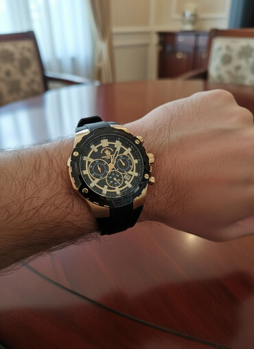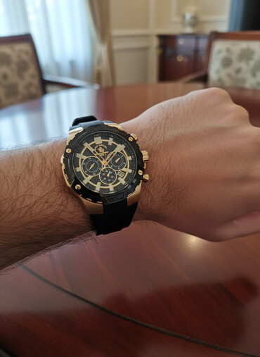 - Siferblat: qara fon, qızılı indekslər və əllər, yüksək oxunaqlılıq