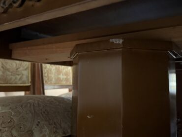 - Masa: düzbucaqlı, geniş səthli, mərkəzdə massiv sütun ayaq; üst hissədə dekorativ oyma haşiyə; ortadan açılan əlavə panel (masa ölçüsünü böyütmək üçün)