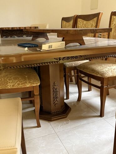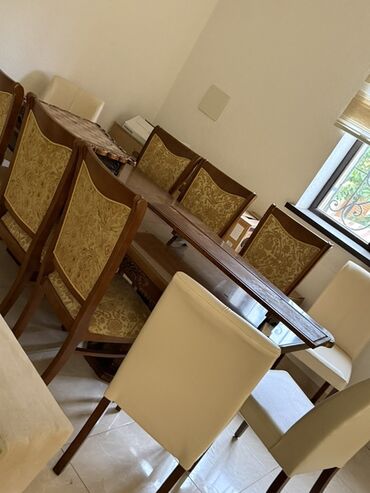 - Oturacaqlar: 8 ədəd taxta karkaslı stul; arxa və oturacaq hissəsi qızılı naxışlı parçayla üzlənib; əlavə olaraq 4 ədəd krem rəng süni dəri üzlü stul