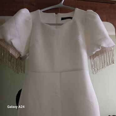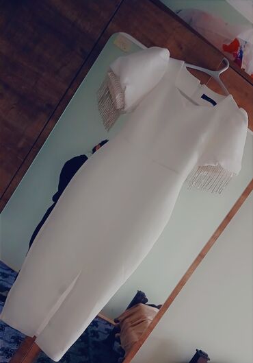 Gümüşü rəngli, zərif gecə/libas paltarı. - Tam boy, düz kəsim siluet - Parıltılı və xırda muncuq işləməli parça - Uzun, şəffaf tüllü qol: üzərində daş/muncuq bəzəkləri - Yelkənvari tül örtü...