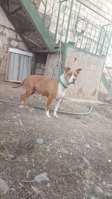 Amerikan Pit Bull Terrier tipajında gənc it. - Rəng: açıq qəhvəyi (fawn) bədən, sinə və ağız nahiyəsində ağ ləkələr - Qulaqlar yarımqat, quyruq uzun - Atletik quruluş, qısa tüklü örtük - Boynunda ...