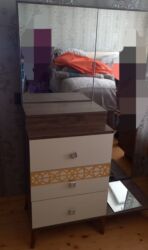 - Eynı dizaynda kiçik komod/tumba: üstündə güzgülü dekorativ qutu, aşağıda açıq rəf.
