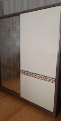 - Geniş sürgülü qapılı şkaf: bir qapısı güzgülü, digər qapısı krem rəngdə; ortadan dekorativ qızılı naxışlı panel.