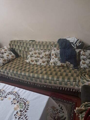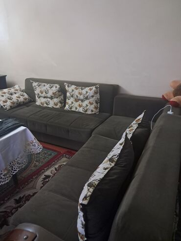 - Komplekt: L‑şəkilli böyük künc divan + uyğun dekorativ yastıqlar (çiçək naxışlı).