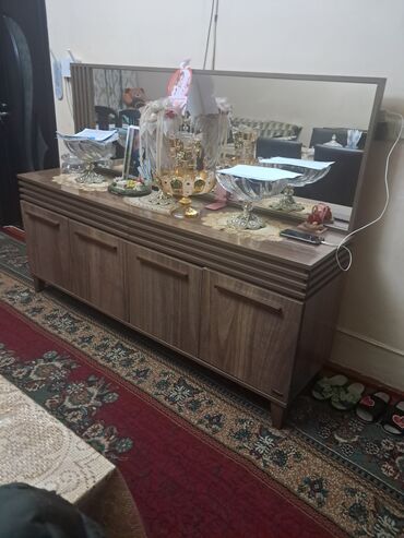 Qeyd: Şəkillərdə ayrıca göstərilən uzun divan və güzgülü konsol/komod da mövcuddur (taxta teksturalı, dörd qapılı alt hissə və iri güzgü paneli). İstəyə görə birlikdə kombinlənə bilər.