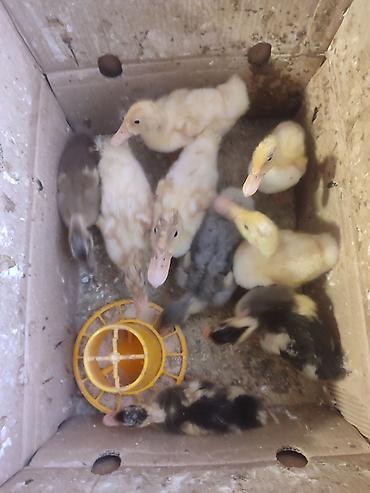 Ördək balaları – müxtəlif rənglərdə civcivlər - Növ: ev ördəyi balaları (mix rəngli – sarı, qara, boz çalarlar) - Təxmini yaş: yeni çıxmış/ilk həftələr - Qrup halında saxlanılır; saman altlıq, yem...