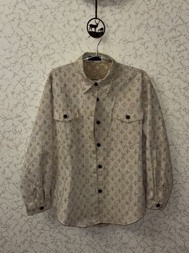 - Bej rəngli uzunqol köynək: tam düyməli, iki ədəd döş cibləri, manjetli qollar. Parça üzərində monogram naxışlı motivlər, düymələr tünd rəngdə kontrast yaradır.