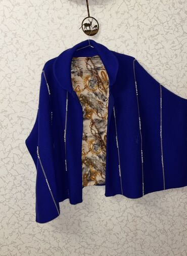 - Kobalt-mavi üst geyim/kaftan: açıq kəsim, yumru yaxa, yanlardan və ön hissədən nazik parlaq bəzək zolaqları, rahat oversize forma. Daxilində naxışlı astar.