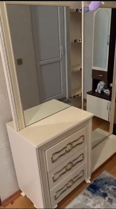 Yataq otağı dəsti – 760 AZN Çatdırılma pulsuz Komplektə daxildir: - 4 qapılı dolab: iki güzgülü orta qapı, yanlarda rəf və asılqan bölmələri, qızılı dekor xəttləri. - Dresser (makiyaj masası) və...