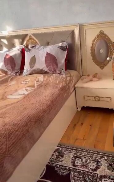 Yataq otağı dəsti – zərif qızılı detallarla Komplekt tərkibi: - Yumşaq başlıqlı, parça üzlü iri ölçülü çarpayı (ortopedik döşəklə). Kənarlarda tutacaqlar, başlıqda dik tikişli panel və güzgü-qızıl...