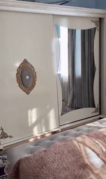 Yataq otağı mebel dəsti Tərkibi: - Geniş sürgülü qapılı dolab: Ön hissədə böyük dairəvi güzgü kompozisiyası, kənarlarda qızılı naxış dekorları. Metal sürgü mexanizmi, yuxarıdan-aşağıya profil çərç...