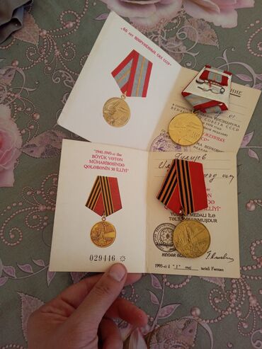 Məhsul: Sovet dövrünə aid medal dəsti Təsvir: - 2 ədəd “1945–1985 Böyük Vətən Müharibəsində Qələbənin 40 illiyi” yubiley medalı (bürünc tonlu), ön üzündə ulduz və əsgər fiqurları, arxa üzündə rusc...