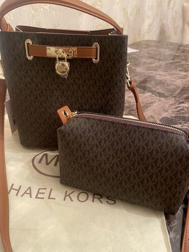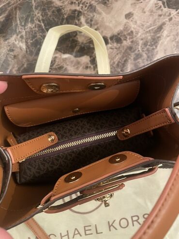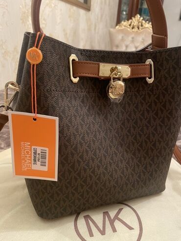 Michael KorsMichael Kors-dan qəhvəyi rəngli loqotipli orta olculu çanta. Bu dəbli çanta gündəlik istifadə üçün əladır və içərisində əşyalarınızı saxlamaq üçün kiçik bir bölməsi var. Üzərindəki qızılırəngli kilid çantaya xüsusi bir görünüş verir. Həm əldə, həm də çiyində daşımaq üçün idealdır.