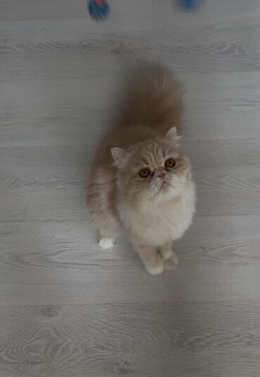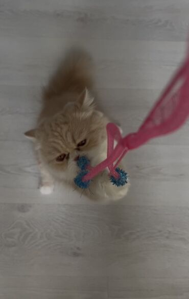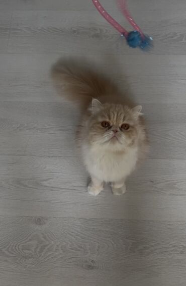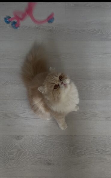 Pers çinsi pişik – uzun tüklü, yastı sifətli, krem-ağ rəng kombinasiyalı.