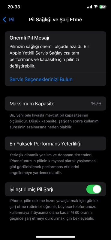 - Batareya sağlamlığı: 76% (ekrandakı “Pil Sağlığı və Şarj Etmə” bölməsində göstərildiyi kimi)
