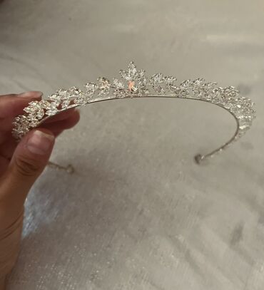 Qızıl tonlarda tac – bəzək daşlı, premium görünüş - Material: metal ərinti, qızılı rəng örtük - Bəzək: iri armud formalı fuksiya/yarpaq qırmızı daşlar, şəffaf kristal rhinestonlar; ikiqat alt çərç...