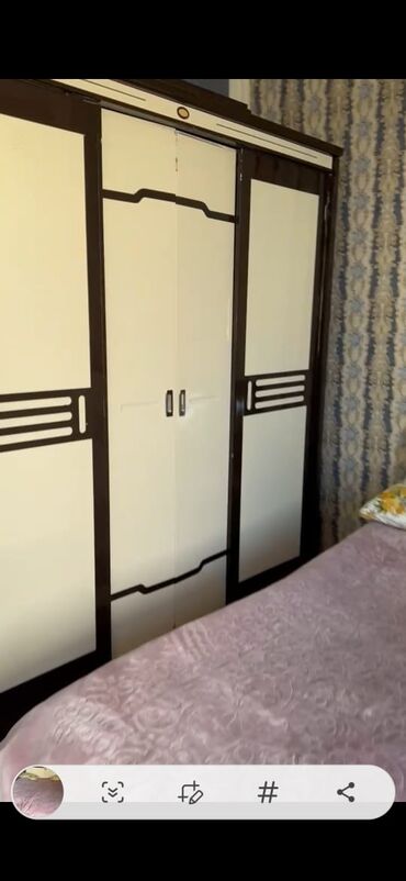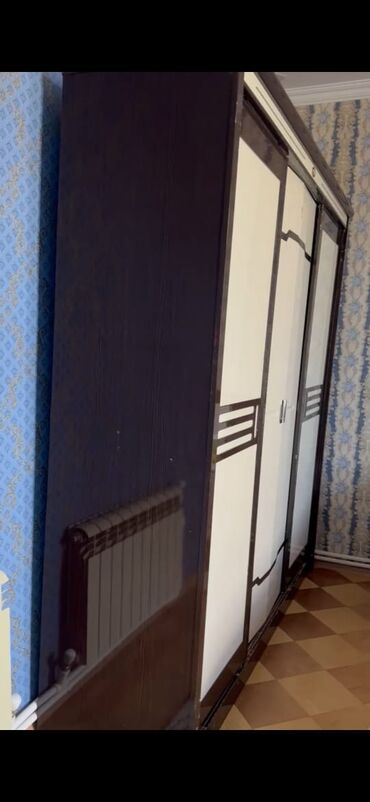 - 3 qapılı sürgülü qarderob (iki rəng: ağ və tünd qəhvəyi). Yan və üst hissələr tünd, ön panellərdə dekor xətləri. Geniş saxlancla ideal; asılqan və rəf bölmələri mövcuddur.