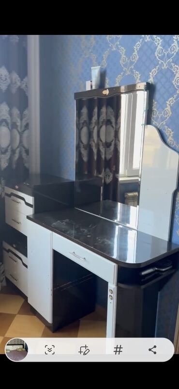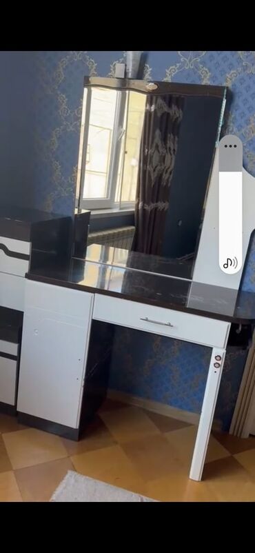 - Makiyaj masası/güzgülü komod. Böyük güzgü, geniş iş səthi, yan hissədə bir neçə çəkmece və açıq bölmə, ortada əlavə çekmece.