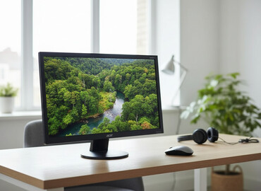 Acer LCD monitor - Ekran ölçüsü: təxmini 19–20 düym (4:3 nisbəti) - Rəng: qara, mat ekran örtüyü - Ön panel: OSD idarəetmə düymələri (menyu, yönləndirmə, giriş seçimi və s.) - Girişlər: VGA ...