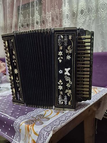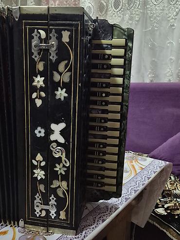 Məhsul: Köhnə tip klavişli akkordeon (daxili mexanizmləri ilə) Təsvir: - Korpus: Qara rəngli, dekorativ naxışlı ön panel, ana-klaviatura sağ tərəfdə. - Klaviatura: Sağ əl üçün pianino tipli ağ-qar...