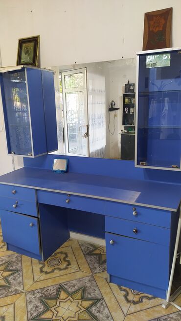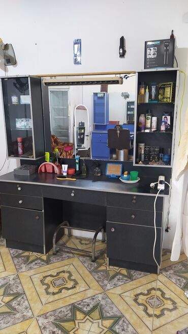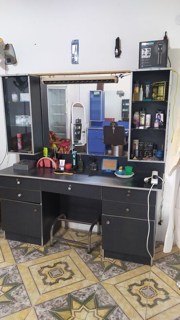 Bərbər/salon üçün iş stansiyası – güzgülü masa və divar vitrinləri